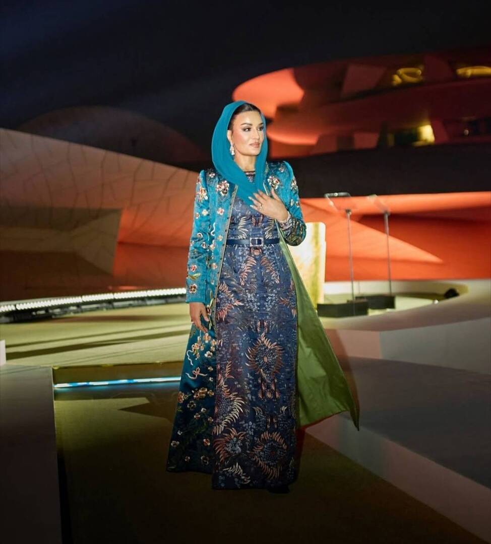 وتألقت والدة أمير قطر بإطلالة أنيقة تجسدت في فستان طويل باللون الأزرق البترولي، مستوحى من تصميم القفطان المغربي، مع تطريزات بيج برسومات فاخرة. كما زين خصرها حزام رفيع من نفس اللون، مما أكسب الطلة مزيدًا من الفخامة.