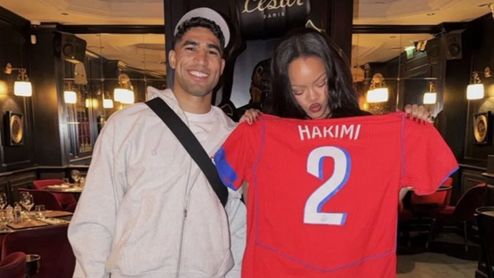 وبعد حصولها على القميص، حرصت ريهانا على التقاط صورة مع حكيمي، وتم تداولها بشكل واسع على مواقع التواصل.