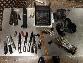 وشملت قائمة الممنوعات: 44 قطعة أثرية تنتمي لعصور عدة، منها سيف أثري يعود إلى العصر الأموي، وطائرة تجسس، و7 قطع من الملابس العسكرية، و134 غرام من المخدرات، و17 قطعة سلاح أبيض.