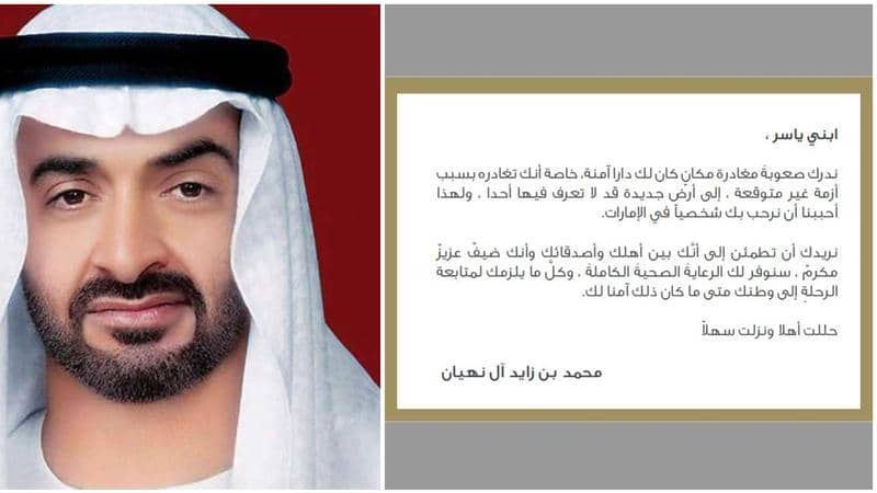 وجاء في إحدى الرسائل: "ابني ياسر، ندرك صعوبة مغادرة مكان كان لك دارا آمنة، خاصة أنك تغادره بسبب أزمة غير متوقعة، إلى أرض جديدة قد لا تعرف فيها أحدا، ولهذا أحببنا أن نرحب بك شخصيا في الإمارات".