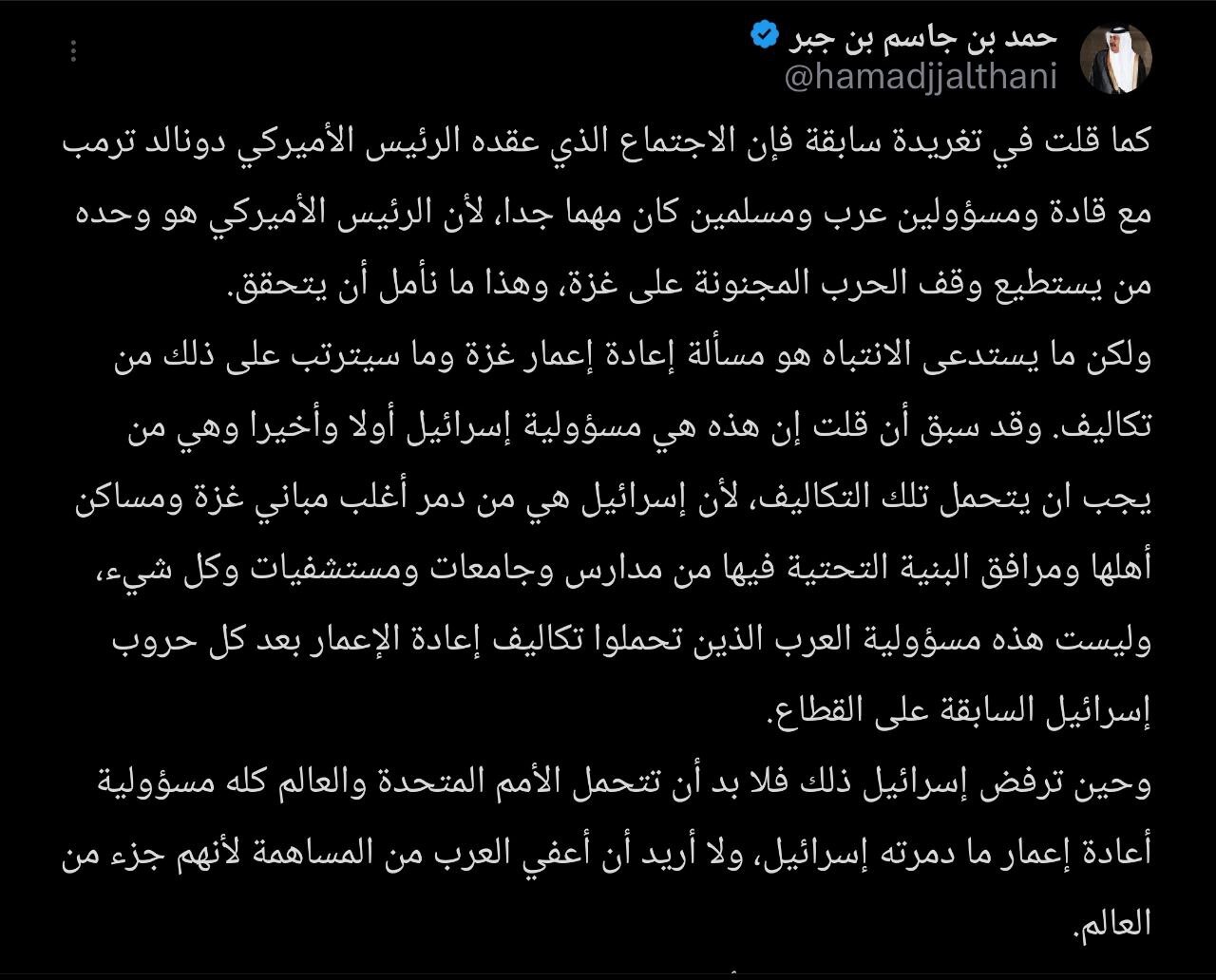 وأردف رئيس وزراء قطر الأسبق: "حين ترفض إسرائيل ذلك فلا بد أن تتحمل الأمم المتحدة والعالم كله مسؤولية أعادة إعمار ما دمرته إسرائيل، ولا أريد إعفاء العرب من المساهمة لأنهم جزء من العالم".
