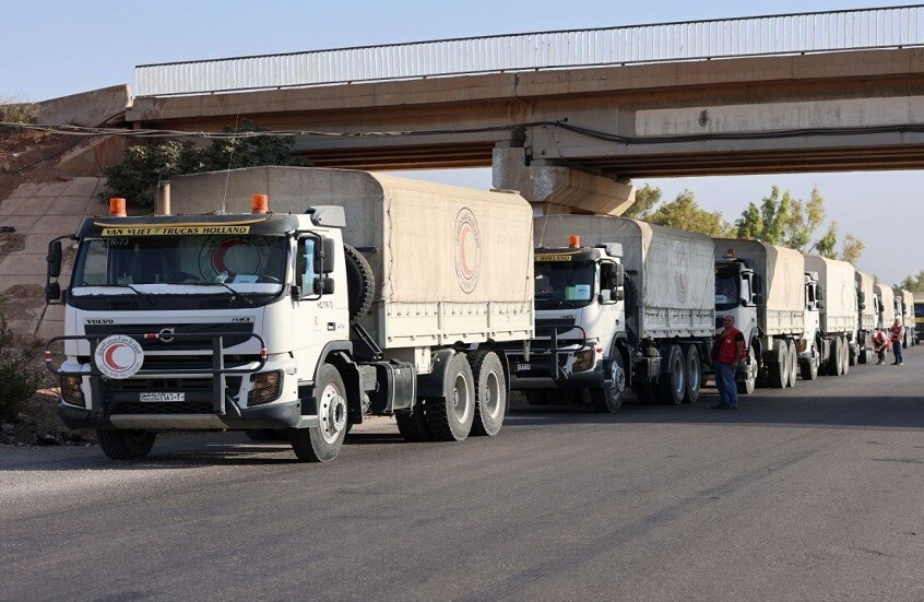 وتتوزع شاحنات القافلة بين 19 شاحنة تابعة للهلال الأحمر العربي السوري، و9 شاحنات للقطاع التجاري، إضافة إلى شاحنة محملة بالطحين، وصهريج مازوت مخصص لتأمين الاحتياجات الخدمية.