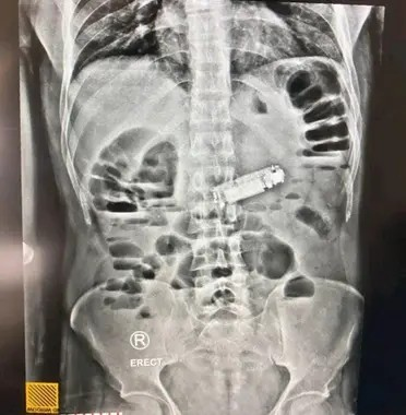 وكشفت الفحوصات الشاملة التي أجريت للمريض، والتي شملت الأشعة المقطعية والتحاليل الطبية، عن وجود جسم غريب يسد فتحة البواب في المعدة، تبين لاحقاً أنه هاتف محمول صغير الحجم.