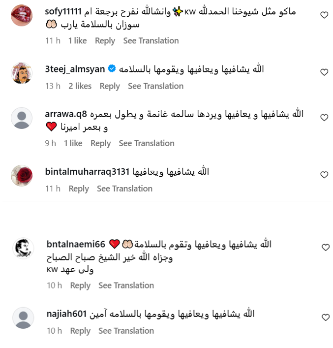 ونشر حساب الفنانة الكويتية القديرة على "إنستغرام" صورة لباقة الورد، وبطاقة كتب عليها: "نتمنى لكم الشفاء العاجل والعودة إلى وطنكم سالمين".