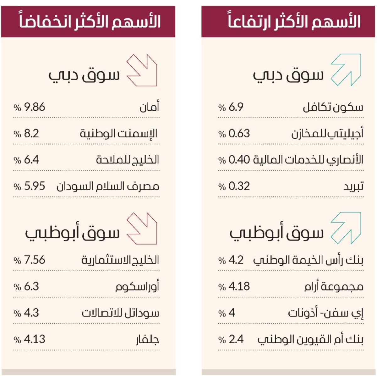 وكان ضمن الأسهم المرتفعة في سوق أبوظبي، أسهم بنك رأس الخيمة الوطني 4.2%، ومجموعة أرام 4.18%، وإي سفن- أذونات 4%، وبنك أم القيوين الوطني 2.4%، في المقابل، تراجعت أسهم الخليج اﻻستثمارية 7.56%، وأوراسكوم 6.3%، وسوداتل للاتصالات 4.3%، وجلفار 4.13%.